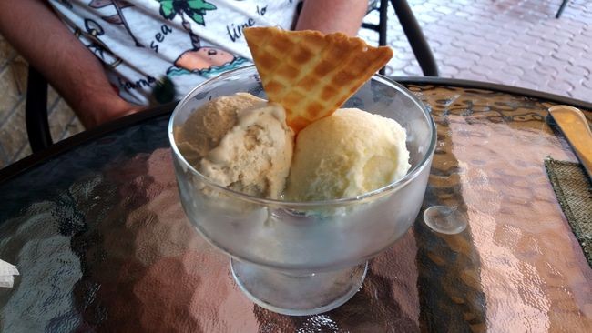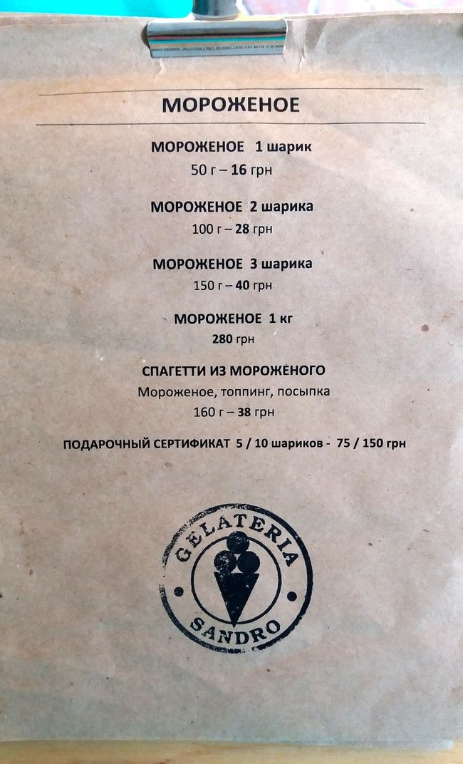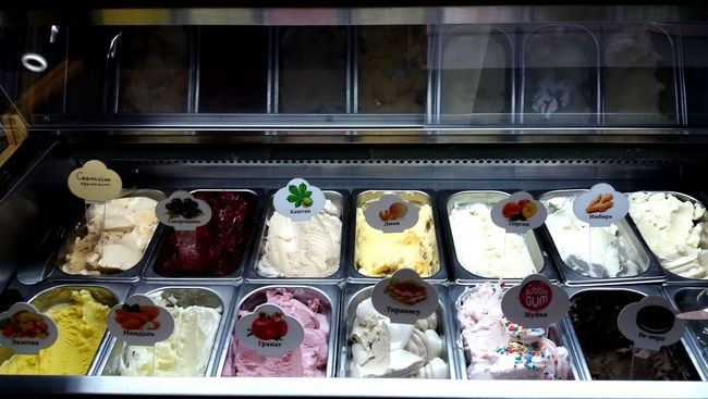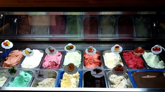 Таким образом, если зайти в кафе и заказать пару шариков мороженого, то это обойдется вам в 28 гривен с человека за любой его вид и вкус. То есть 1 шарик мороженого стоит 16 гривен, 2 – 28, 3 – 40, 5 – 75, 10 шариков – 150 гривен. Также, можно полакомиться «Спагетти из мороженого», в которое входит мороженое, топпинг и посыпка за 38 гривен/160 г.