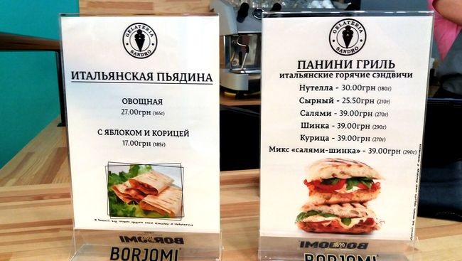 Конечно же, в кафе можно заказать разные виды кофе и чая, горячие напитки, какао, молочные коктейли и лимонады, пирожные, тортики и разные десерты. Кроме всевозможных сладостей и напитков, гостям предлагалась итальянская овощная пьядина за 27 гривен (лаваш с начинкой, поджаренный на гриле) и итальянские сэндвичи с салями, ветчиной, копченой курицей, поджаренные на гриле до хрустящей корочки, за 39 гривен. Описание сэндвича вызвало аппетит, и сразу захотелось перекусить. Заодно и узнать, чем же итальянский сэндвич – «Панини гриль» отличается от других.