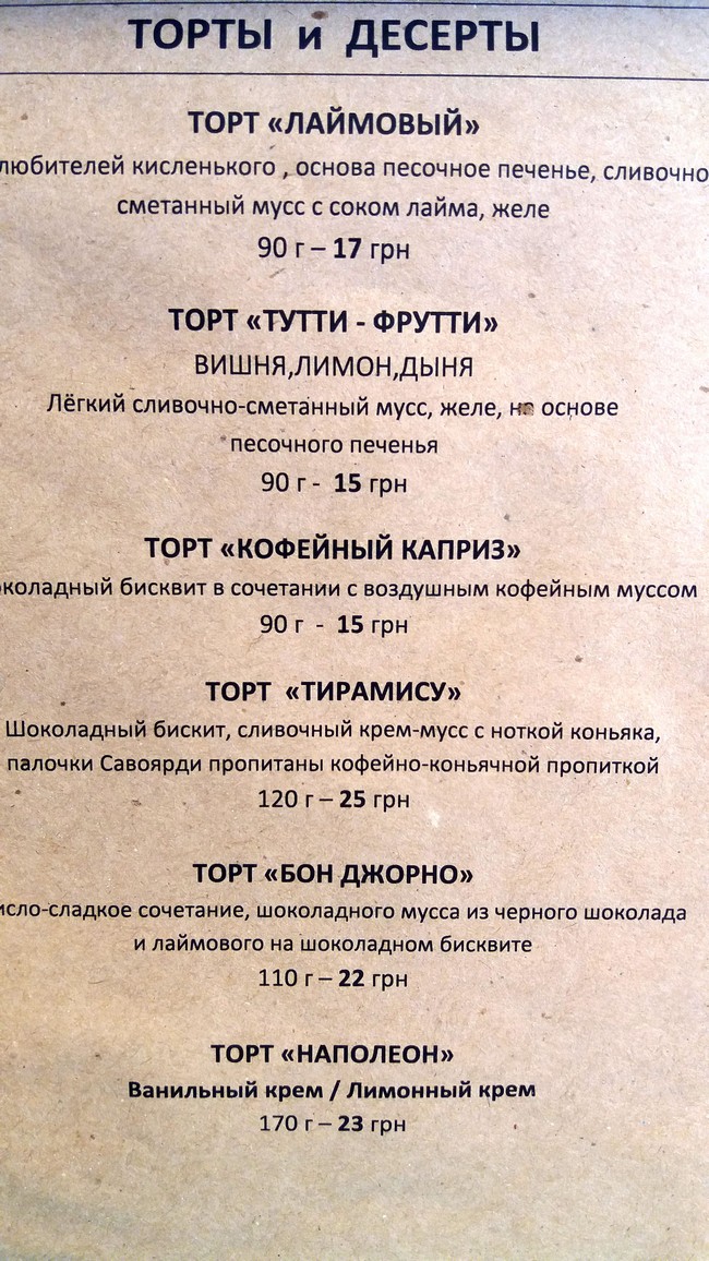 А для любителей кофе, кофейных напитков и тортиков, средний чек составит 25 -55 гривен: кофе и напитки стоят от 12 до 28 гривен, пирожные и торты – от 13 до 27 гривен.