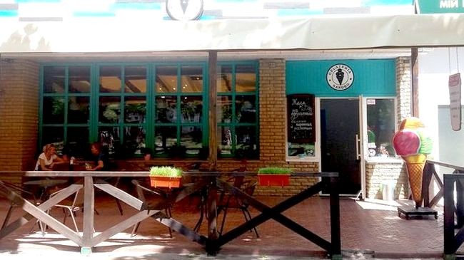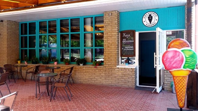 Перед самим кафе – уютная летняя площадка с маленькими круглыми столиками и удобными стульями, где можно спрятаться от солнца. На площадке установлен фирменный знак «Gelateria» - большой рожок с тремя разноцветными шариками мороженого. Под окнами – ящики и вазоны с цветами.