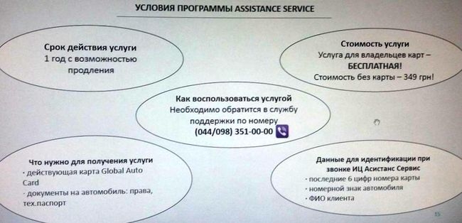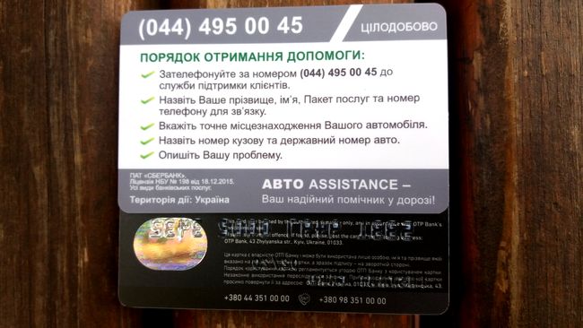 На оборотной стороне карты указан круглосуточный номер телефона клиентской поддержки и описан порядок получения помощи. Также, указано, что карта действует на территории Украины.
