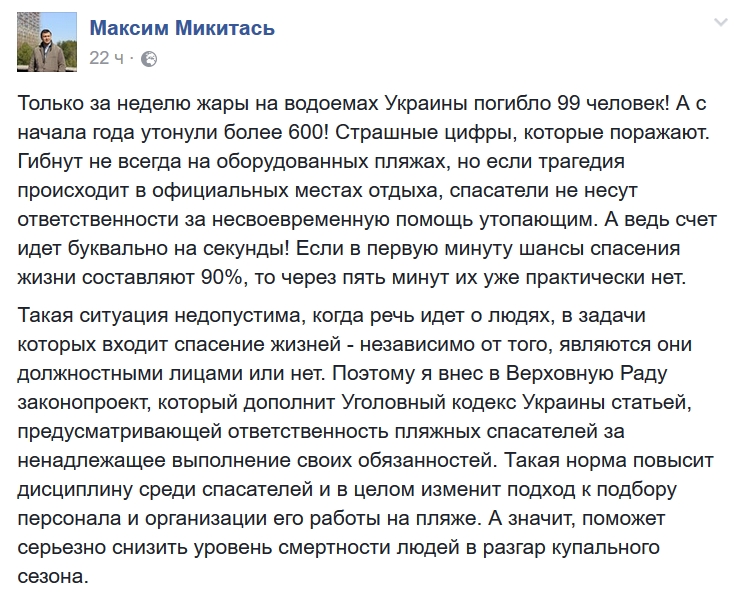 ПОЗИЦИЯ По словам Максима Микитася, которий является автором законопроекта, анализ статистических данных свидетельствует о растущей динамике смертности на воде.