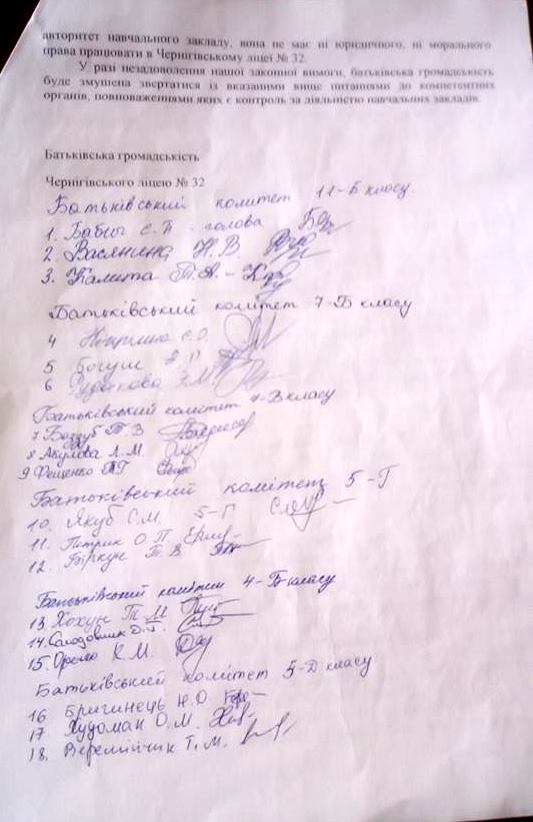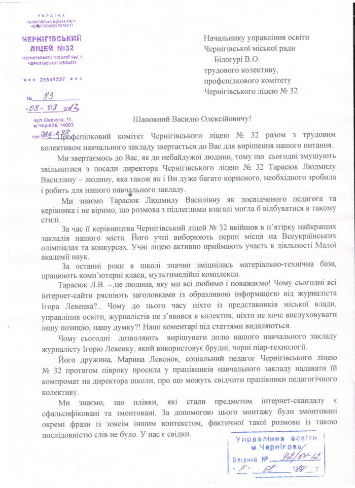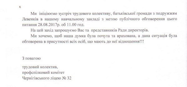 Во вторник, 08 августа, профсоюзный комитет вместе с трудовым коллективом лицея №32 подал соответствующее обращение к начальнику Управления образования ЧМР Василию Билогуре для публичного обсуждения аудиозаписей, и обвинений журналиста Игоря Левенка в адрес директора Людмилы Тарасюк.
