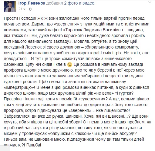 Неприязнь между супругами Левенок и директором имела начало еще в марте 2017 года, когда журналист обнародовал информацию, что в одной из школ ученик сбил с ног учительницу, и та получила закрытую черепно-мозговую травму, повреждения позвоночника, а позже публиковал видео драки школьниц. По мнению Людмилы Тарасюк, Игорь Левенок портил репутацию ее учебного заведения, о чем она подала жалобу в прокуратуру. В свою очередь журналист, жена которого работает в 32 лицее, не замедлил с ответом, и на своей странице в социальной сети фейсбук обнародовал аудиозапись, которая достаточно нелицеприятно характеризирует директора школы. В сделанной аудиозаписи Тарасюк использует нецензурную лексику и называет «малохольными» нынешних начальника управления образования и мэра города.