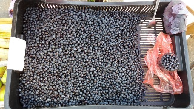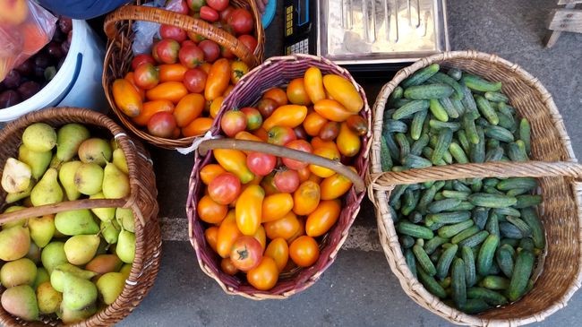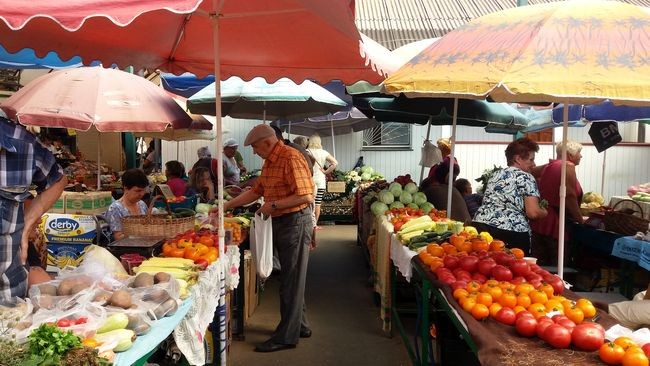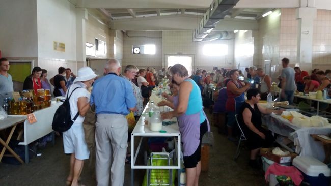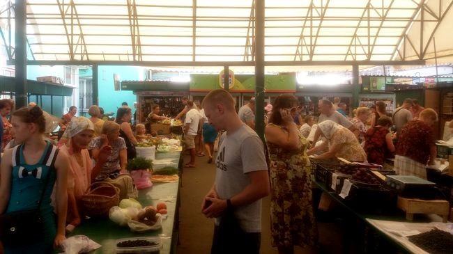 Жители города и близлежащих сел продают всё, что только душа пожелает. Цена на домашние помидорчики немного упала, их можно купить от 8 до 12 гривен. Появились не только темно-фиолетовые баклажаны, но и белые, в которых нет горечи, и их не нужно вымачивать перед приготовлением. В продаже садовая малина, клубника, красная смородина, лесная черника, голубика, белые грибы и лисички. Те люди, которые продают грибы и ягоды, рассказали, что обязательно относят их на проверку в лабораторию. Лаборант отбирает 3 грибочка или ягоды на 200 г и проверяет их на содержание радионуклидов. Проверка стоит 4.50 гривен.