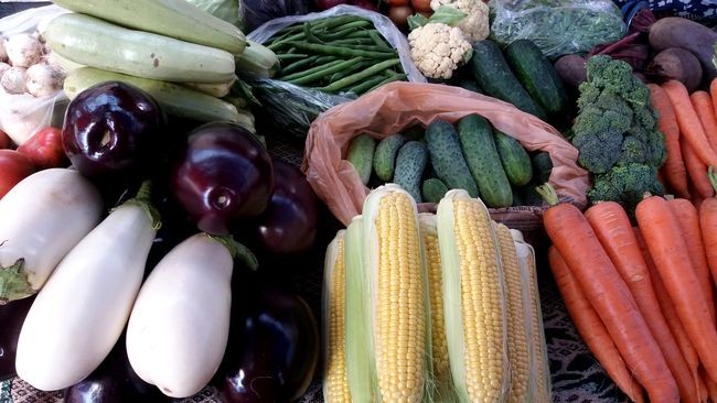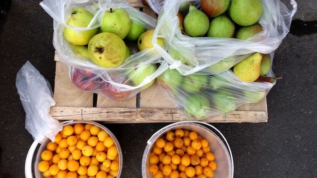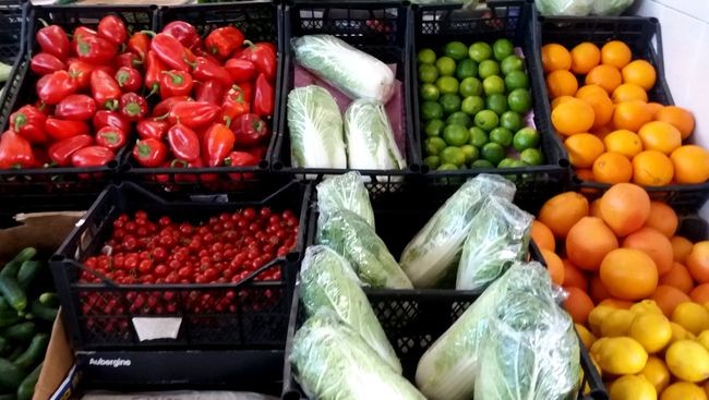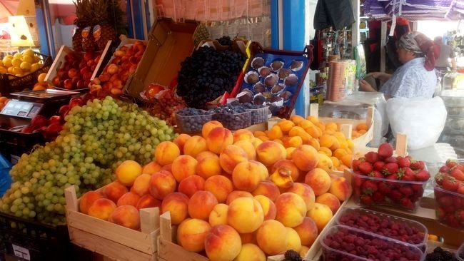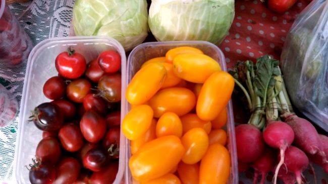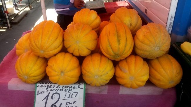 Ассортимент фруктов и овощей на раскладках немного уменьшился, т.к. сейчас горожане покупают в основном не привозные овощи и фрукты, а местные.
