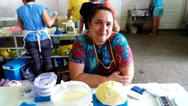 Людмиле Киберча 53 года, приезжает из села Голубичи на центральный рынок 2 раза в неделю: по средам и воскресеньям. Всю молочную продукцию привозит в мини-холодильнике. В хозяйстве у нее две коровы, три поросенка, куры, утки. Творог и молоко Людмила уже продала, осталось домашнее масло и сметана.