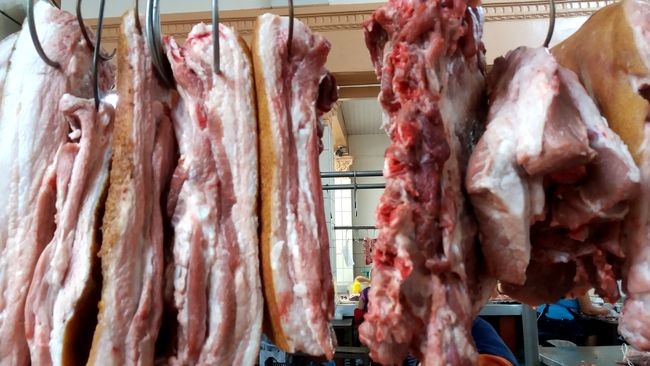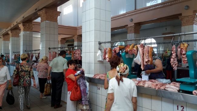 В мясном павильоне немноголюдно. В такую жару многие горожане покупают мясо и сало с самого утра, когда еще более-менее прохладно, и затем выезжают отдыхать на речку или за город. Интересуемся ценами на то, что было и что осталось в продаже. Выяснилось, что цена на ошеек даже ниже, чем на других рынках – 120 гривен вместо 135-140 грн./кг. Самое дешевое сало стоит также не 50, а 40 грн./кг. Цены на остальные части свиной туши – в основном одинаковые по городу.
