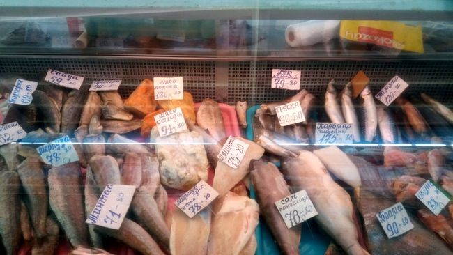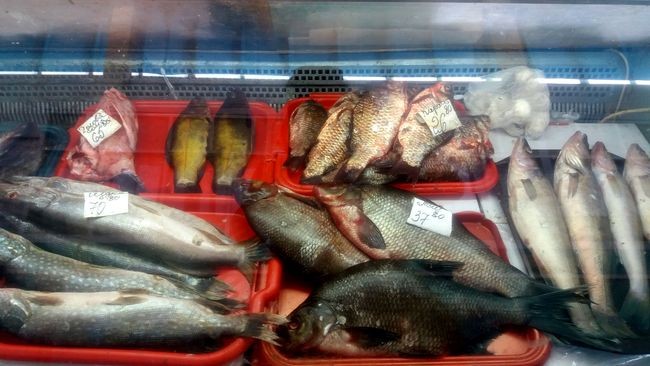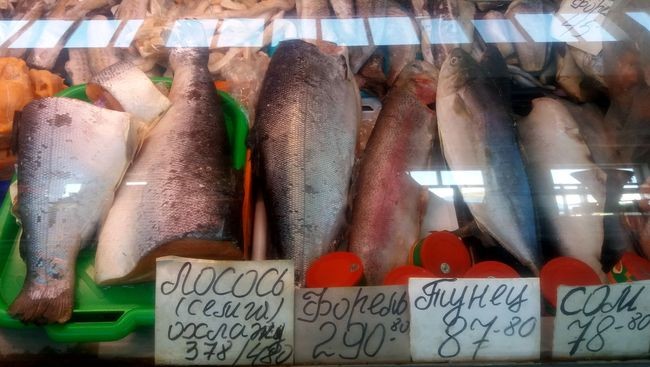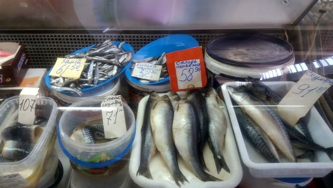 В продаже на рынке, как всегда большой выбор свежемороженой, соленой и охлажденной рыбы. Цены здесь в среднем на 10 гривен выше, чем, например, в Масанах неделю назад.