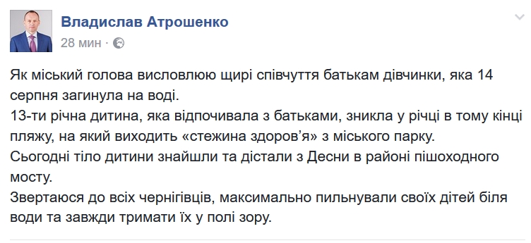 «Як міський голова висловлюю щирі співчуття батькам дівчинки, яка 14 серпня загинула на воді.