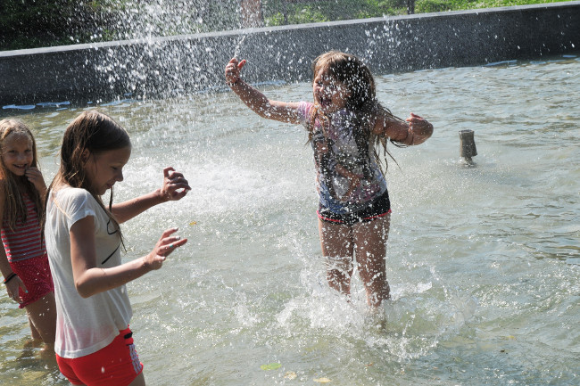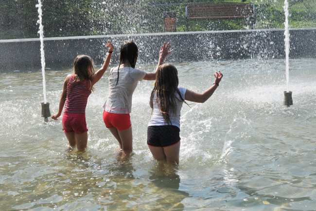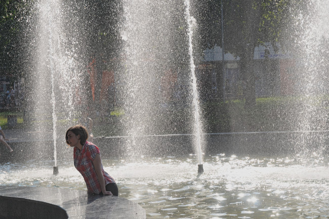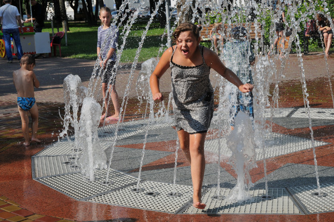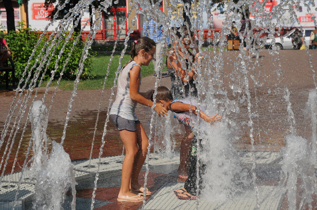 Конечно, многие отправляются на пляж, но не все это могут себе позволить в рабочий день. По распоряжению мэра, городские фонтаны в жару работают с самого утра и в будние дни. Поэтому жители города спасаются от жары у фонтанов. Многолюдно и весело возле пешеходного фонтана, а у музыкального фонтана возле Мегацентра купающихся поменьше, зато здесь более свежо рядом с ним.