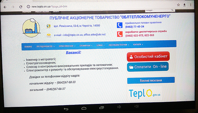 ПАТ «Облтеплокоммунэенрго» заявляет, что показания приборов учета абонент может передать через «личный кабинет» на официальном сайте предприятия. Но, к сожалению, зайти на сайт предприятия по указанному в квитанциях адресу teplo.cn.ua не удалось. С одного из мобильных устройств мы все же попали на сайт, но с приставкой "new".
