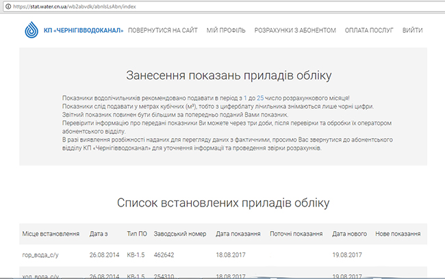 КП «Черниговводоканал» уже давно предлагает услугу «личный кабинет», в котором можно зарегистрироваться на официальном сайте предприятия. Кроме возможности передачи показаний приборов учета там есть еще ряд полезных для абонентов функций. Кроме того, показания можно передать на электронную почту предприятия через форму «Напишите нам».