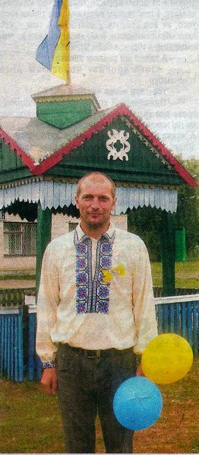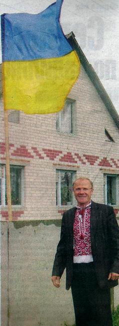 Володимир Антоненко біля колодязя з прапором у центрі села