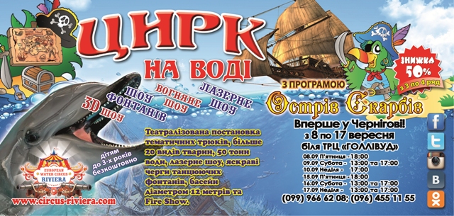 Мы ждём встречи с Вами в Вашем городе!!! Спешите увидеть сами, иначе 100 раз услышите от тех, кто видел.С 8 по 17 cентября состояться грандиозные представления цирка Ривьера в г.Чернигов!