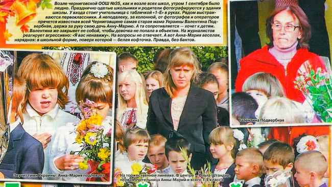 Возле черниговской ООШ №35, как и возле всех школ, утром 1 сентября было людно. Празднично одетые школьники и родители фотографируются у здания школы. У входа стоит учительница с табличкой «1-Е» в руках. Рядом выстраиваются первоклассники. А неподалеку, за колонной, от фотографов и операторов прячется известная всей Черниговщине самая старая мама Украины Валентина Подвербная, держа за руку свою дочь Анну-Марию. А та сопротивляется — хочет к детям. Валентина же закрывет ее собой, чтобы девочка не попала в объектив. На журналистов реагирует агрессивно: «Я вас ненавижу». На вопросы не отвечает. А вот Анна-Мария веселая, нарядная: в школьной форме, поверх которой — белая кофточка. Правда, без бантов.