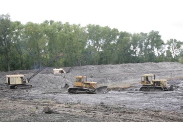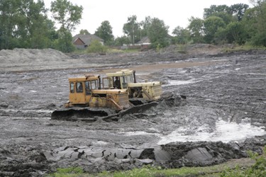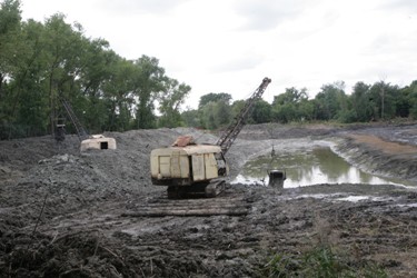 Під’їжджаємо ближче: два бульдозери розгортають мул і сунуть його ген на пологий край берегів. А на іншому боці працюють екскаватори, поглиблюючи дно і вигортаючи на берег чорний мул.