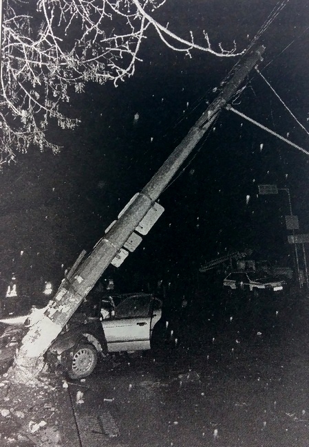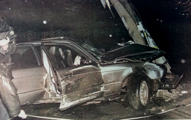 По свидетельству очевидцев, мчавшийся на бешеной скорости БМВ-525 попытался обойти справа отходивший от остановки троллейбус, но водитель легковушки не справился с управлением - и в районе мебельного салона магазина «Союз» набитый подгулявшей молодежью автомобиль врезался сначала в металлический столб со знаком «Пешеходный переход», а потом - в бетонную опору линии электропередачи. Сила удара была такова, что бетонная глыба надломилась и под углом в 45 градусов повисла над проезжей частью, а комфортабельная машина в мгновение ока превратилась в груду металла. И только автомобильный радиоприемник, даже спустя два часа после аварии, продолжал наполнять искореженный салон тихой музыкой.