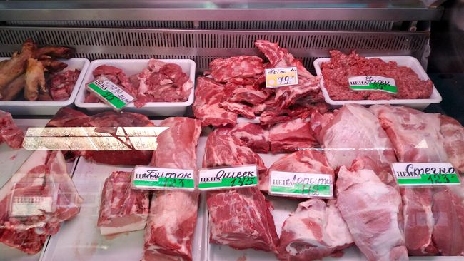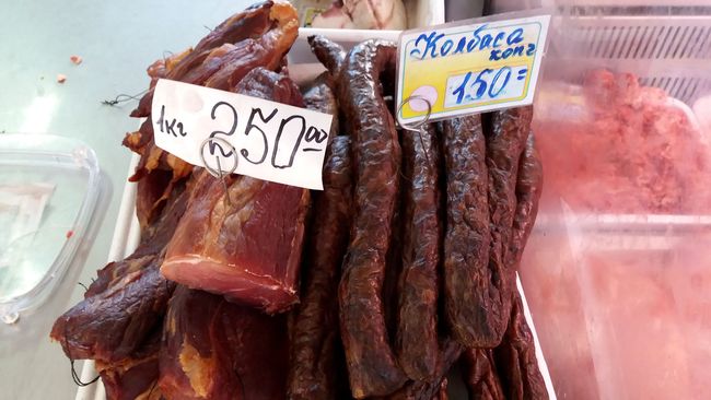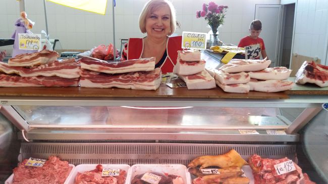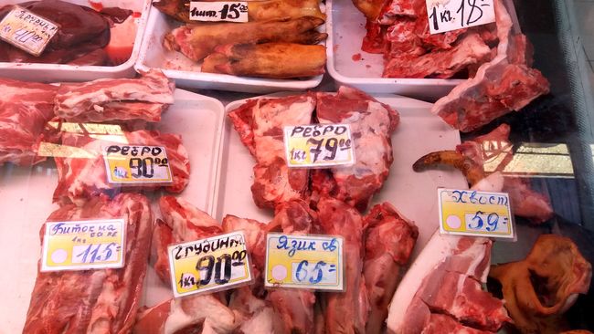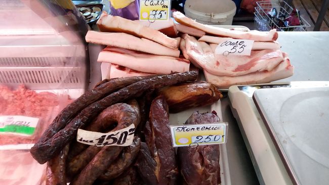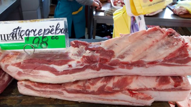 Цены на свиное мясо за эти 2 месяца поднялись в среднем на 10 гривен. Что касается сала, то здесь еще можно купить тоненькое сало по 55 гривен за кг, а подчеревок по 98 гривен, в отличии от рынка в Масанах. В продаже есть также копченое мясо и колбаса домашнего производства.