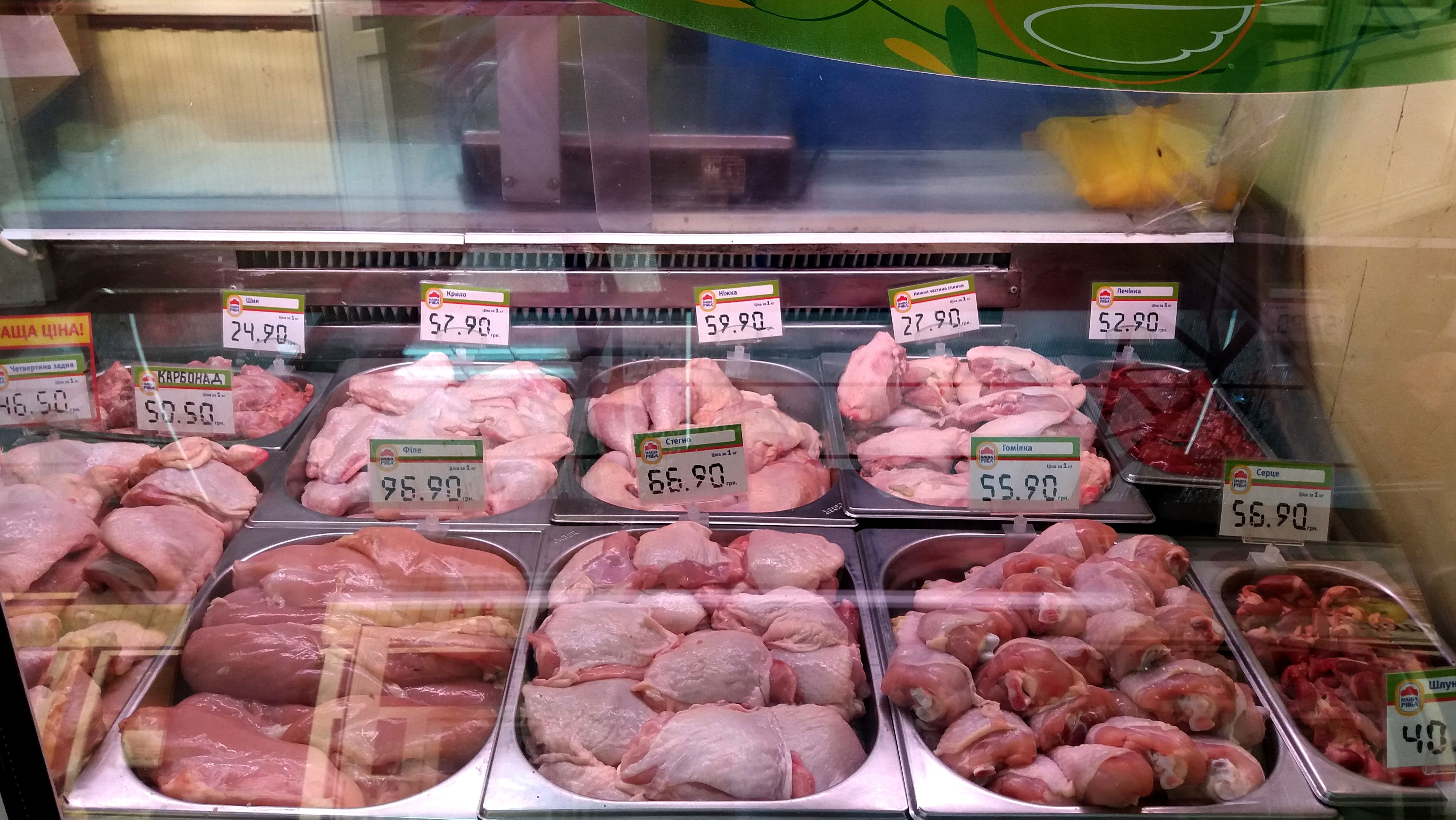 В отдельном магазинчике в продаже есть курятина. По сравнению с ценами на рынке в Масанах неделю назад, здесь некоторые части курицы на 0, 50 -1 гривну выше: