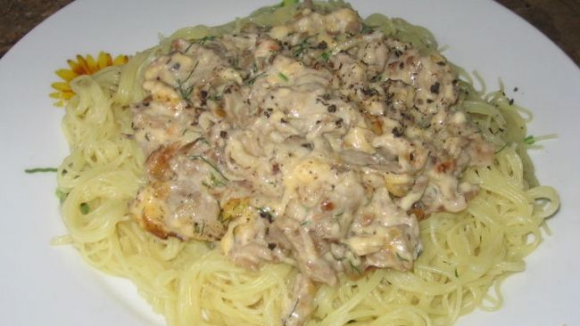На тарелку выкладываем макароны, а сверху много соуса. По желанию посыплем свежемолотым черным перцем. Можно принять за курятину. По вкусу эти грибы чем-то ее напоминают.