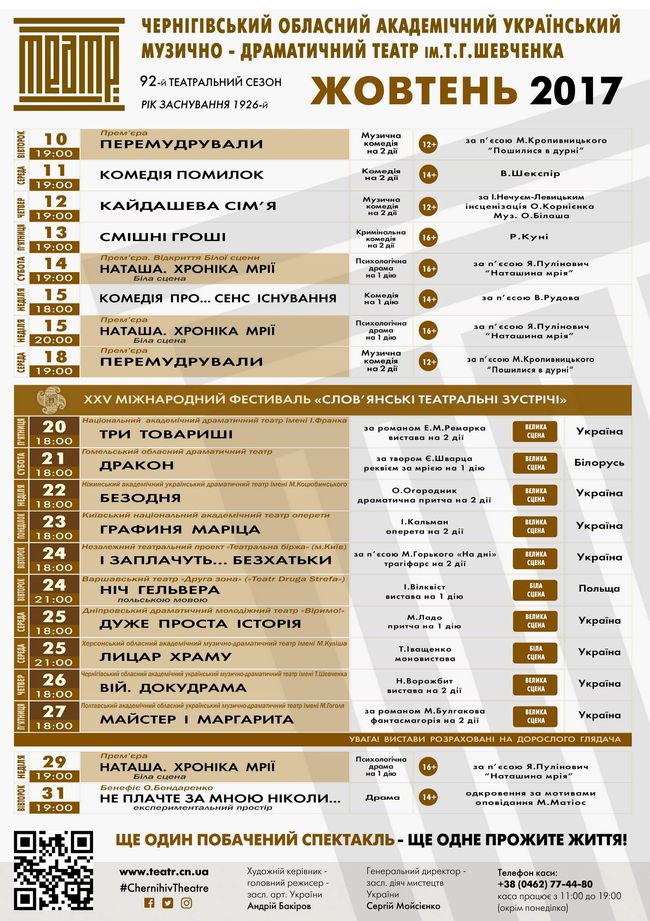 Хочу вас проінформувати, що відкриття 92-го театрального сезону Чернігівського обласного академічного українського музично-драматичного театру імені Т.Г.Шевченка відбудеться 10 жовтня.