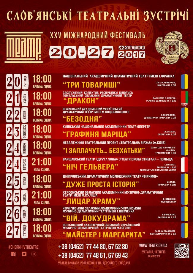 З 20 по 27 жовтня на базі Чернігівського театру відбуватиметься XXV Міжнародний фестиваль «Слов’янські театральні зустрічі». Участь у ювілейному фестивалі «Слов’янські театральні зустрічі» візьмуть 10 театральних колективів з України, Білорусі, Польщі: 2 Київських – Національний академічний драматичний театр імені Івана Франка та Національний академічний театр оперети, драмтеатри з Дніпра, Ніжина, Полтави і Херсону; наші білоруські колеги з Гомеля та польські майстри театрального мистецтва з Варшави. У програмі фестивалю представлені спектаклі, поставлені за відомими творами літературної класики в осучасненому режисерському прочитанні, й вистави нинішніх драматургів, що відображують різноманітні грані нашого сьогодення.