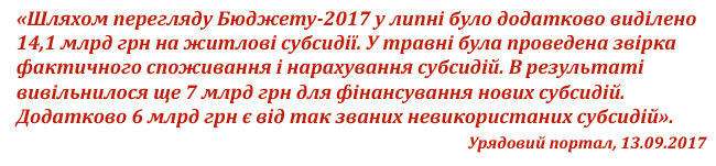 Зокрема, 55,1 млрд грн з державного бюджету будуть спрямовані на адресні субсидії на оплату житлово-комунальних послуг, 7 млрд грн з місцевих бюджетів – на пільги на оплату житлово-комунальних послуг. 2,7 млрд грн передбачено у бюджеті на надання пільг та субсидій на придбання твердого палива і скрапленого газу. 57,9 млрд грн закладено в проекті Державного бюджету на 2018 р. на виплату малозабезпеченим сім'ям та іншим отримувачам соціальної допомоги. При цьому соціальні стандарти зростатимуть швидше за інфляцію». Урядовий портал, 25.09.2017.