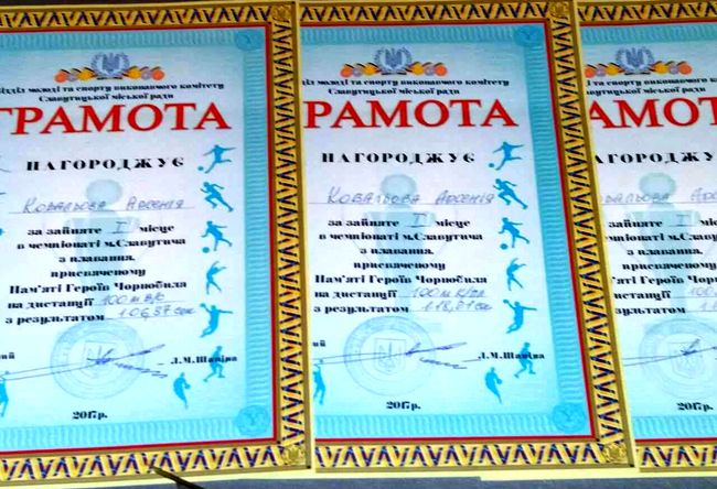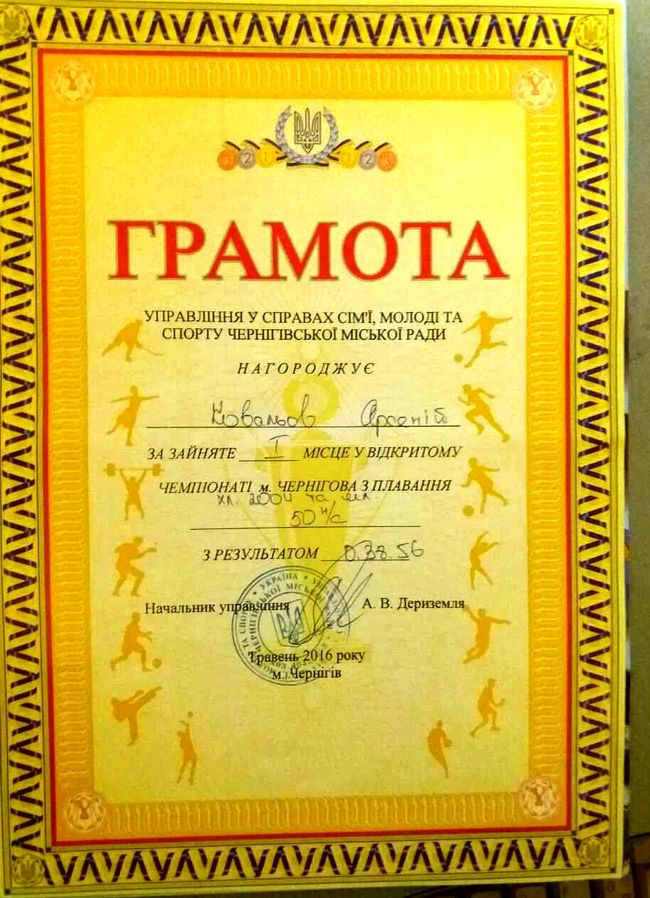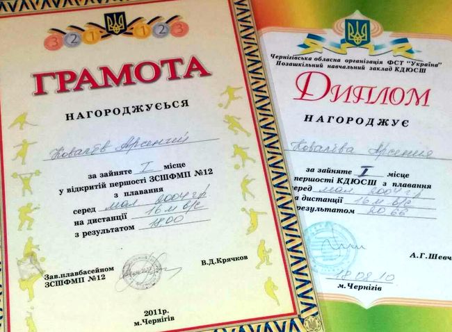 - В мае этого года прошел Чемпионат первенства Киевской области по плаванию среди юниоров в Броварах. Арсений занял 3-место в плавании на дистанции 100 м кролем. В июле просто принимал участие в Чемпионате Украины во Львове. В декабре пройдет Чемпионат Украины среди юниоров. Что касается наград, у Арсения уже достаточно много грамот, дипломов, медалей, кубков.