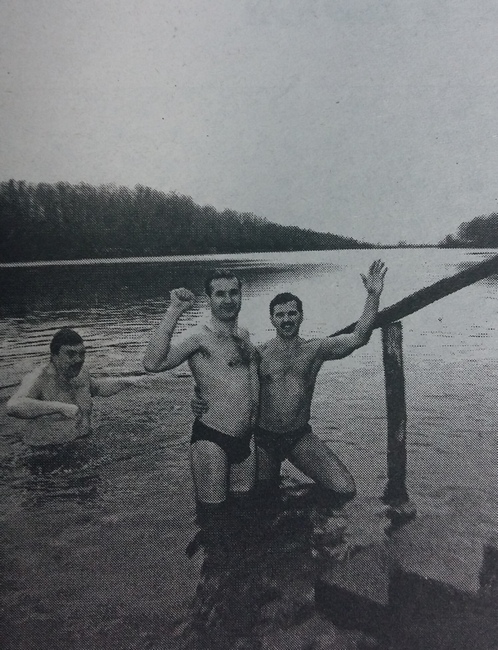 Когда, зевая и поеживаясь от пронизывающего холода, мы с фотокором прибыли на место, нас уже ждали жизнерадостные и бодрые люди, готовые погрузиться в ледяную реку. Свободная ото льда Десна лениво несла свои свинцовые воды вдоль унылых, голых берегов. От одной мысли о том, что в эту обжигающую воду можно войти по собственной воле, перехватывало дыхание. Однако «моржей» совершенно не смущала перспектива оказаться в ледяной купели. Они с удовольствием общались-с журналистами, делясь всеми премудростями и секретами экстремального купания.