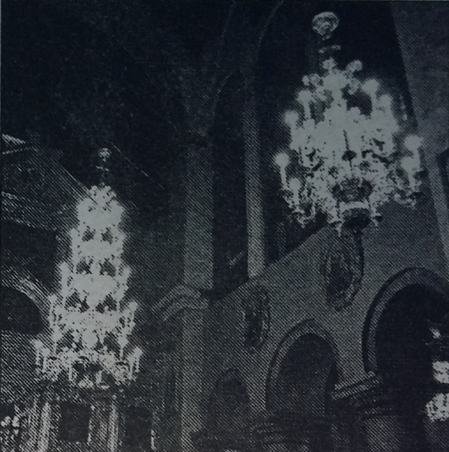Большое паникадило, центральное, насчитывает пять ярусов, 46 лампочек и весит около 350 кг; маленькие же, висящие в боковых пределах, рассчитаны на 18 лампочек каждое и весят по 140 кг.