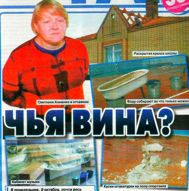 — Пусть так, — говорит депутат районного совета, заместитель председателя комиссии по вопросам коммунальной собственности Александр Верхуша, — но, перед тем как снимать шифер с такой площади крыши (по предварительным данным, более 800 кв. м, хотя строители утверждают, что наполовину-меньше, а вот учителя говорят, что над кабинетами химии и информатики не было даже защитной плёнки. — Авт.), надо было детально изучить прогноз погоды. А потом, когда уже случилось, первое, что подсказывает здравый смысл: вызвать аварийную бригаду. Так нет же - как работали 3-4 человека, так и работают.