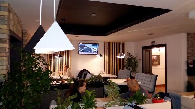 Особое внимание привлекают интересные конструкции из натуральной древесины на потолке и окнах, и…пение птиц. Сначала подумалось, что их пение звучит из доносящейся из колонок музыкальной композиции, а потом оказалось, что в зале стоят клетки с птичками, которые поют.