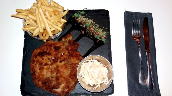 А свиной в панировке шницель с соевым соусом, картофелем фри и тоже салатом коул-слоу был подан на черном квадратном каменном блюде из сланца, и оказался довольно сочным и вкусным.