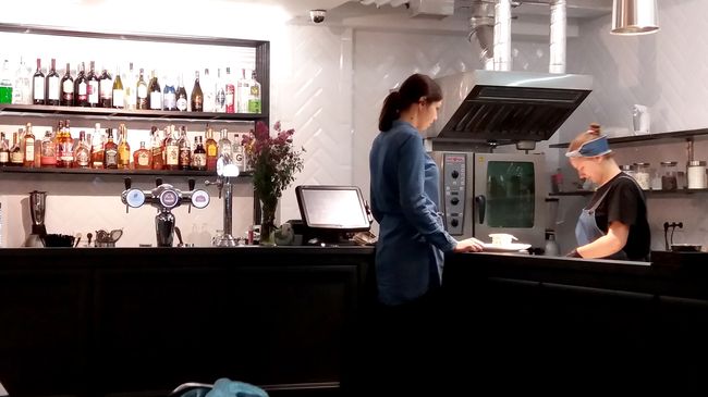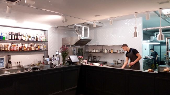 Алкогольные напитки (водка, вина, ром, виски, текила, шампанское и др. размещены на полках за большим барным прилавком. За ним же - и кеговая установка, и кофемашина с кофемолкой, и все что необходимо для работы бармена и бариста. Ну, и конечно же, рядом с рабочей зоной бармена - ставшая мировым модным трендом – открытая кухня, своеобразная сцена без тайн от посетителей.