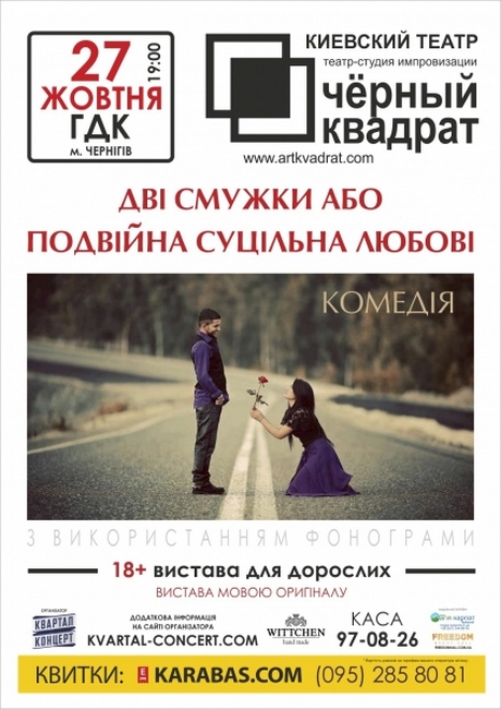 27 октября в Городском Дворце Культуры Чернигова в 19:00 встречайте премьеру! Новый спектакль театра «Черный квадрат» - «Две полоски или Двойная сплошная Любви»!