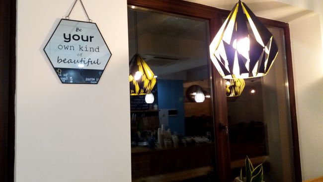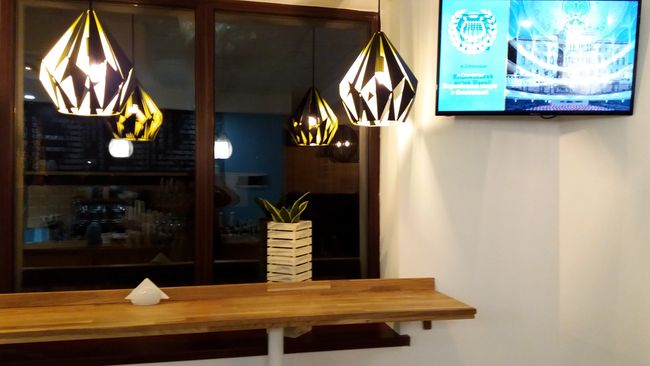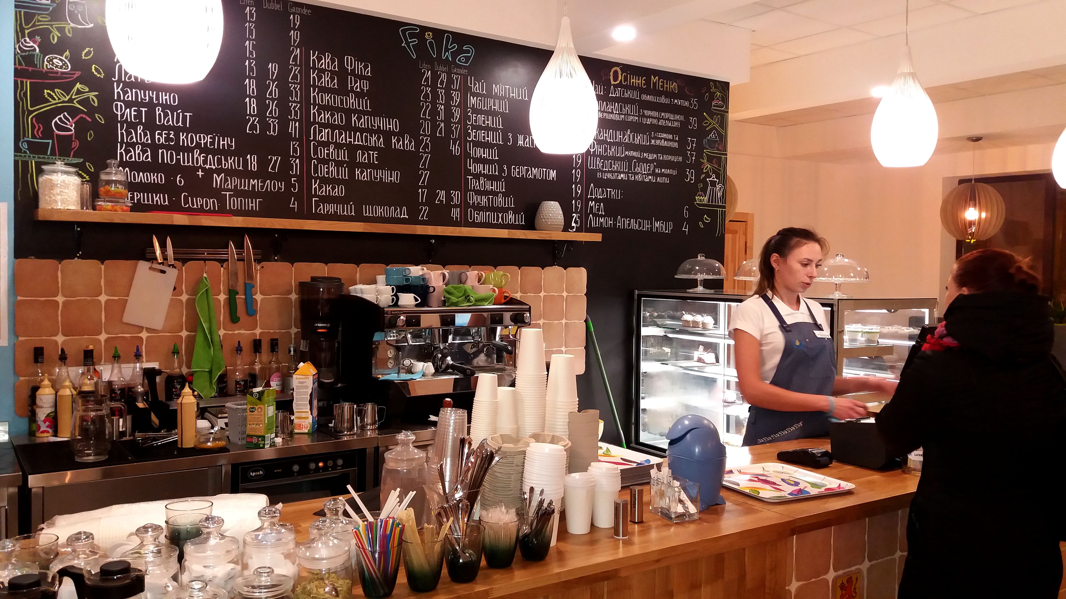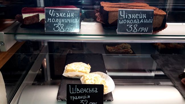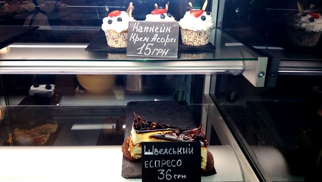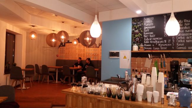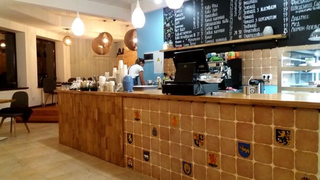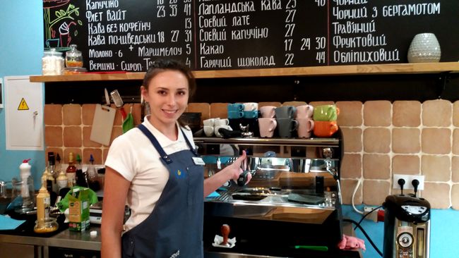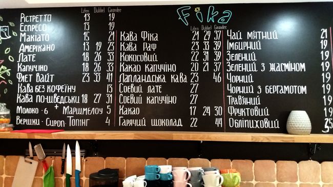 Что характерно, информация об ассортименте напитков на специальной доске и десертов, выпечки на ценниках, указана на украинском языке, а бариста Виктория очень радушно и вежливо общается с гостями на чистом мелодичном украинском языке, который редко услышишь в нашем городе. Это весьма примечательно для скандинавского кафе в сравнении с кафе «Lovka», которое названо украинским словом, но официантки и администратор говорят исключительно на русском.