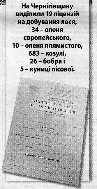 За словами начальника мисливського відділу, проекти на добування сохатих подали 13 мисливських господарств області із 59. Дозвіл полювати на 45 тварин отримали менше половини. Найбільше лосів добудуть у мисливському господарстві «Єлінський ліс», що в Сновському районі, - 4 особини, по дві тварини - у МРП Корюківської районної організації УТМР, мисливських господарствах «Рись» і «Деснянське», що на Козелеччині. Ліцензія на лося коштує від 15 до ЗО тисяч гривень, вартість полювання встановлюють користувачі мисливських угідь. А за сам бланк ліцензії мисливські господарства сплачують до державної скарбниці дві тисячі гривень.
