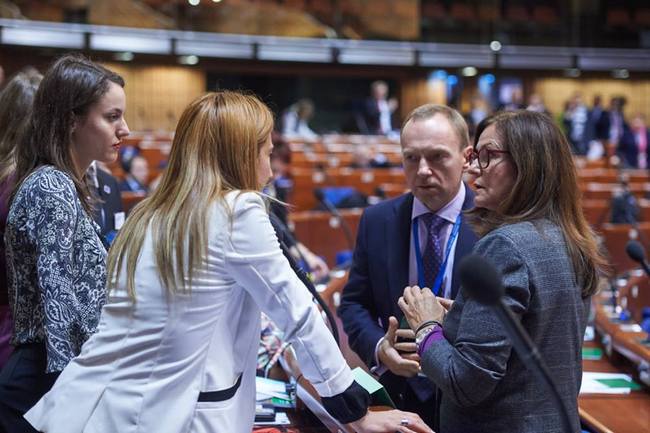 На фото: Президент Конгресу місцевих та регіональних влад Ради Європи Гудрун Мозлер-Тьорнстрьом і член української делегації Владислав Атрошенко спілкуються з молодіжними делегатами на 33 сесії