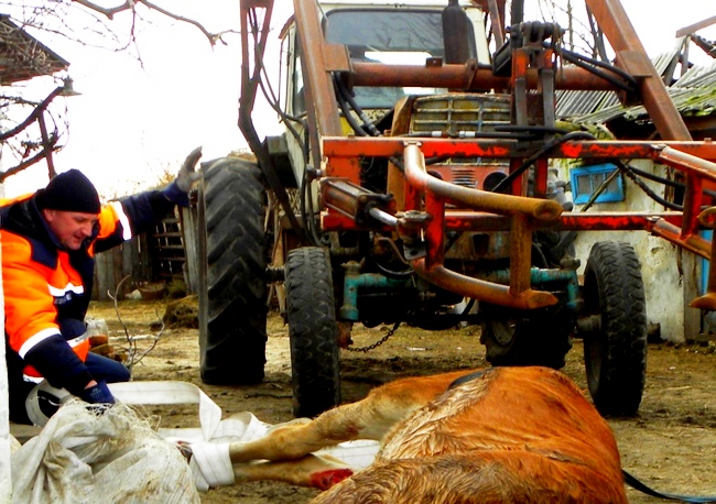 — Траншея и глубиной, и длиной два метра, корова оказалась там полностью зажата. Мы приехали по вызову сразу, - рассказывает начальник 24-й Государственной пожарно-спасательной части 4-го государственного пожарно-спасательного отряда Управления ГСЧС Украины в Черниговской области Александр Губарь. — Спасибо, главный механик Борзнян-ского лесхоза Константин Куторга откликнулся — позволил задействовать их трактор-подъемник. Мы подвязали пожарные рукава и спасательные веревки у коровы под брюхом, привязали их к гидроподъемнику, после чего трактор поднял животное.