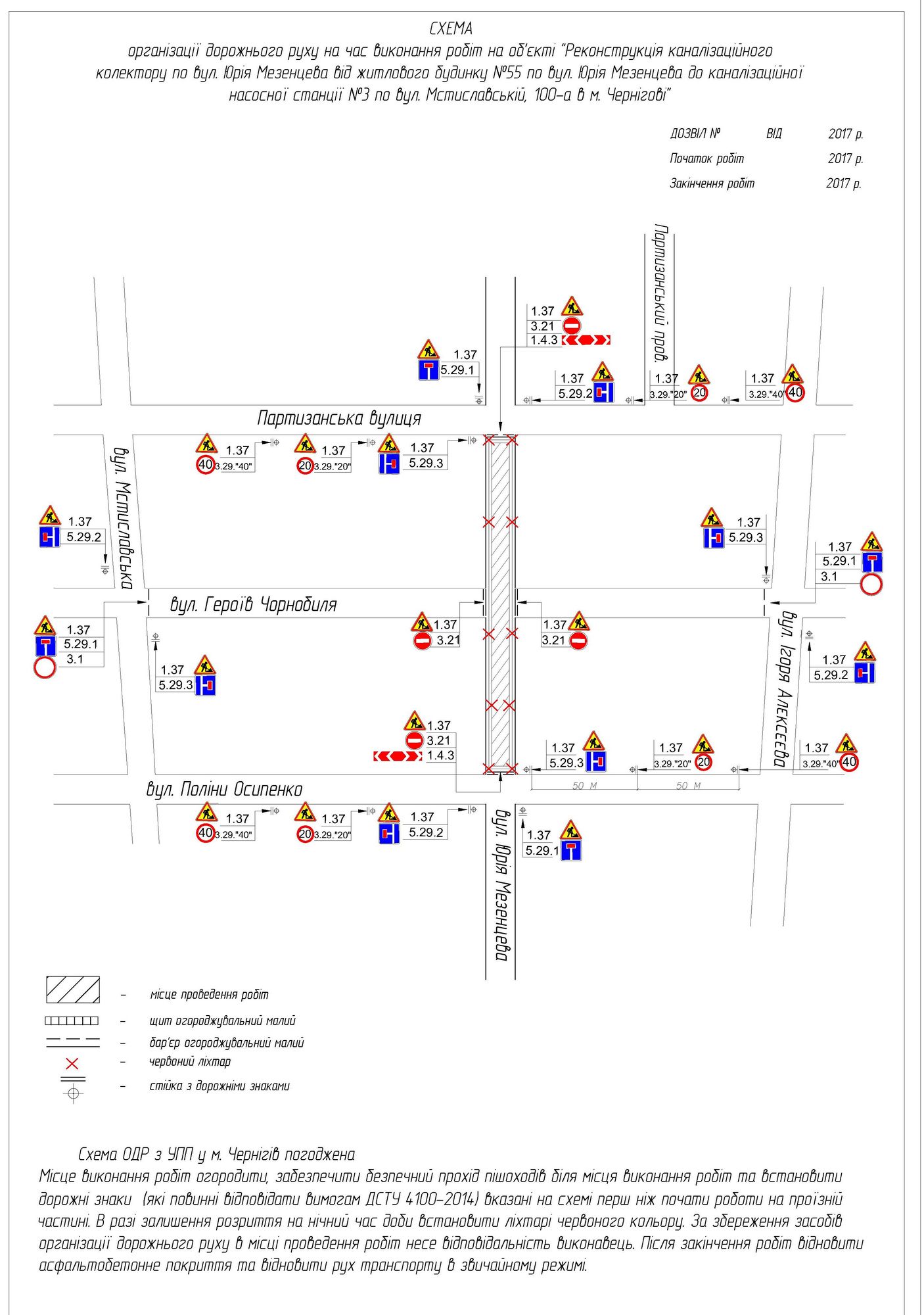 З 21 по 24 жовтня 2017 року в м. Чернігові у зв’язку з прокладанням колектору на перехресті вул. Героїв Чорнобиля з вул. Ю. Мезенцева рух автотранспорту перекриватиметься по вулиці Героїв Чорнобиля на ділянці від проспекту Миру до вулиці І. Алєксєєва.