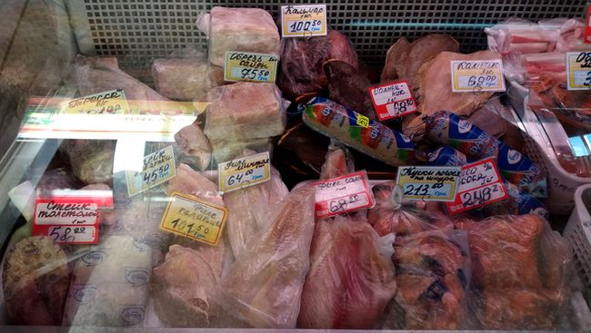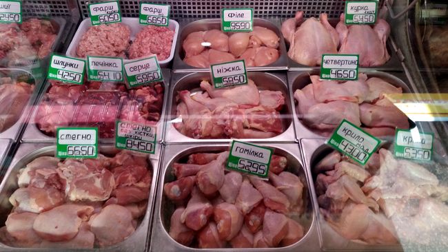 Цены на мясную продукцию за полтора месяца после последнего нашего посещения не изменились. Самое дешевое сало стоит 75 гривен, самое дорогое – 120.