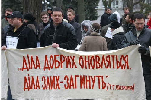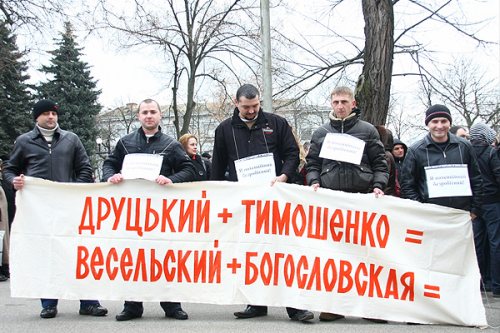 Митингующие держали в руках таблички с надписями «Друцкий союз – мыльный пузырь», «Друцкий + Тимошенок = Весельский+Богословская», а также таблички-распечатки «Я потенційний безробітний».