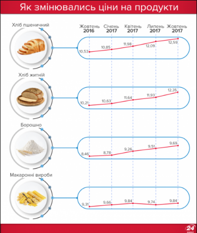 Также менялась цена на хлеб. Например, пшеничный и ржаной хлеб подорожали более чем на две гривны. Мука поднялась в цене с 8,46 до 9,69 гривны за 1 кг. Макароны почти не подорожали. Средняя цена изменилась с 9,31 до 9,84 гривны.