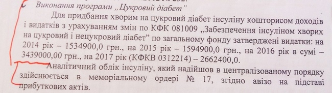 «Програмою «Цукровий діабет» на боротьбу з діабетом передбачено солідарне фінансування як з обласного, так і з місцевого бюджетів, - пояснює лікар. – Згідно з міською цільовою програмою, учасником є аптека №190 КП Чернігівської обласної ради «Ліки України». Натомість препарат закуповували у Запорізькому обласному ендокринологічному диспансері і це підтвердили державні фінансові аудитори в акті ревізії».