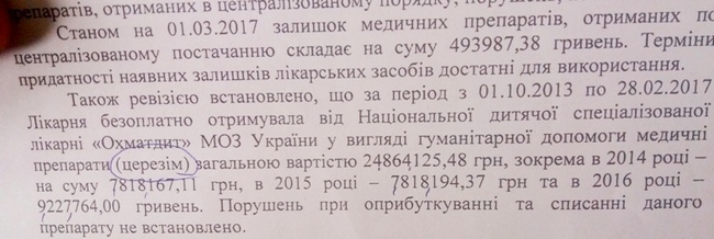 Згідно з даними перевірки Управління північного офісу Держаудитслужби в Чернігівській області, за період з 1 жовтня 2013 року по 28 лютого 2017 року Прилуцька центральна міська лікарня безоплатно отримала від Національної спеціалізованої лікарні «Охматдит» МОЗ України у вигляді гуманітарної допомоги препарати «Церезим» загальною вартістю 24 мільйони 864 тисяч гривень. Зокрема, у 2014 році лікарня отримала «Церезиму» на суму 7 мільйонів 818 тисяч гривень, у 2015 році – приблизно таку ж, у 2016 – на 9 мільйонів 227 тисяч гривень.