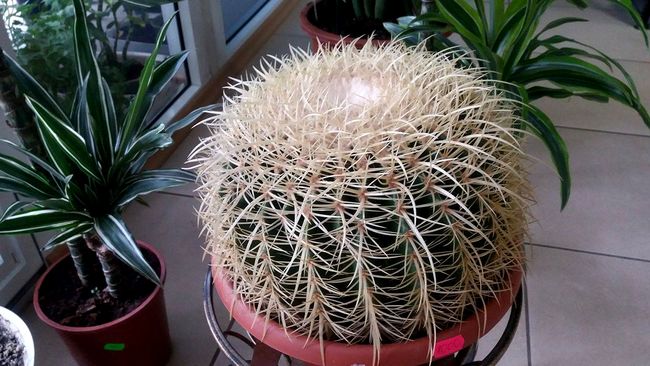 Эхинокактус Грузони выглядит как бочонок (его называют еще «золотой бочонок»), в комнатных условиях до 40 см в диаметре. Формирует около 30 рёбер, с немного изогнутыми белыми или желтоватыми колючками. Цена 1000 грн.