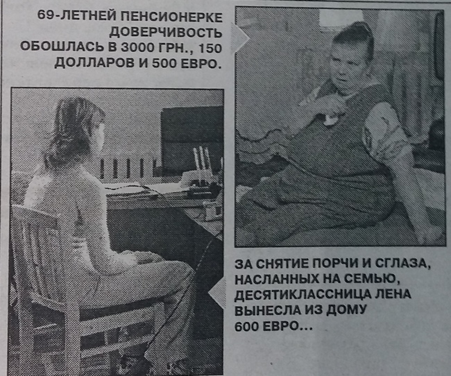 3 февраля десятиклассницу Лену у подземного перехода встретила незнакомая женщина лет 50 и попросила подсказать, как пройти к ближайшему рынку. Отзывчивая и доброжелательная девочка согласилась. Слово за слово - и «добрая» незнакомка предложила помочь снять «порчу» с семьи Лены. В этот момент к ним подошла вторая, более молодая мошенница, сыгравшая роль «очистившейся» от сглаза и порчи, и они вдвоем принялись убеждать Лену «спасти» свою семью. Нужен для этого сущий «пустяк»: принести деньги, в которых, якобы, таилось все зло. После специального ритуала «очищения» эти деньги уже не смогут принести вред. К этому времени воля девочки была полностью парализована: чтобы помочь близким, она была готова на все. Находясь под воздействием внушения, Лена побежала домой, взяла 600 евро и отнесла их мошенницам.
