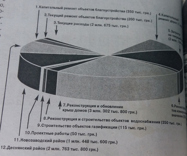 В этом номере мы впервые попытаемся показать конкретные цифры, предусмотренные в бюджете Чернигова-2005 на развитие жилищно-коммунального хозяйства города. При этом необходимо иметь в виду, что основные показатели, отраженные в диаграмме, учитывают различные источники финансовых поступлений, а названные суммы будут осваиваться разными распорядителями. Кроме указанных цифр, в Новозаводском и Деснянском районных бюджетах также предусмотрены дополнительные средства на капитальный ремонт жилья, уборку территории, озеленение и т. д., которые мы и показали в нашей диаграмме.
