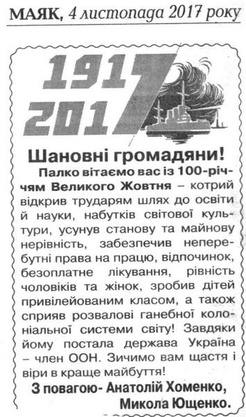 Настоящая буча поднялась в области после выхода 4 ноября очередного номера корюковской районной газеты «Маяк». На одной из страниц читатели увидели... поздравление со 100-летием Великого Октября. Стоит ли говорить, что на газетчиков набросились все и сразу? Но действительно ли они пытались обойти закон «О декоммунизации» или просто дали маху?